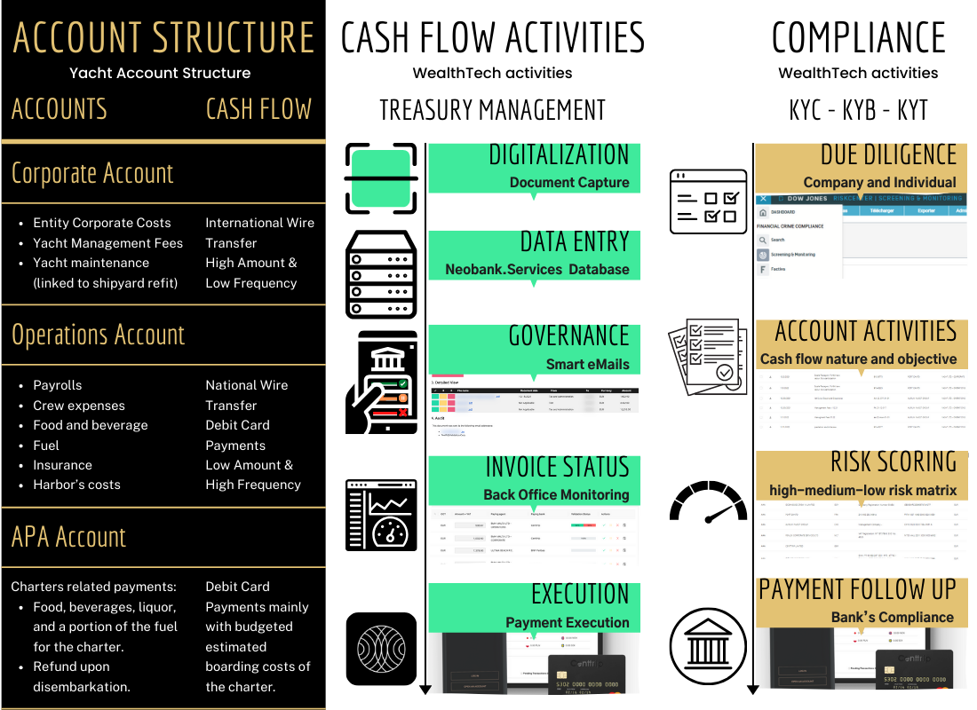WealthTech plays a crucial role in Super Yacht Treasury Management. Effectively managing the cash flow of yachts, which often involves international payments in multiple currencies and high-value transactions, demands both efficiency and security. Our primary focus is on optimizing the process of managing yacht cash flows while ensuring strict compliance with every transaction.